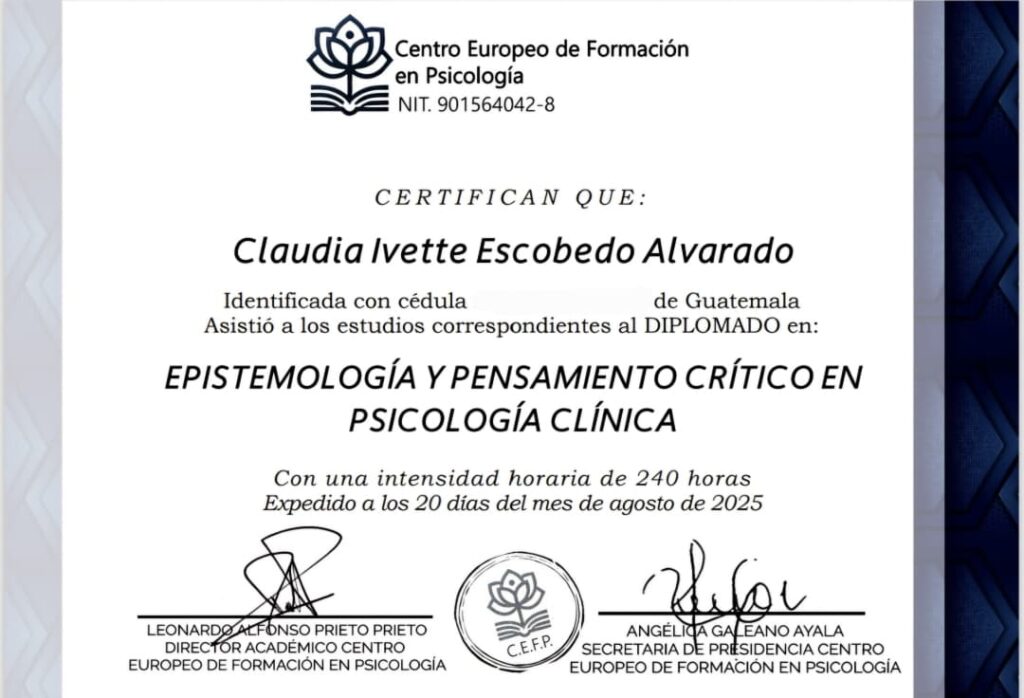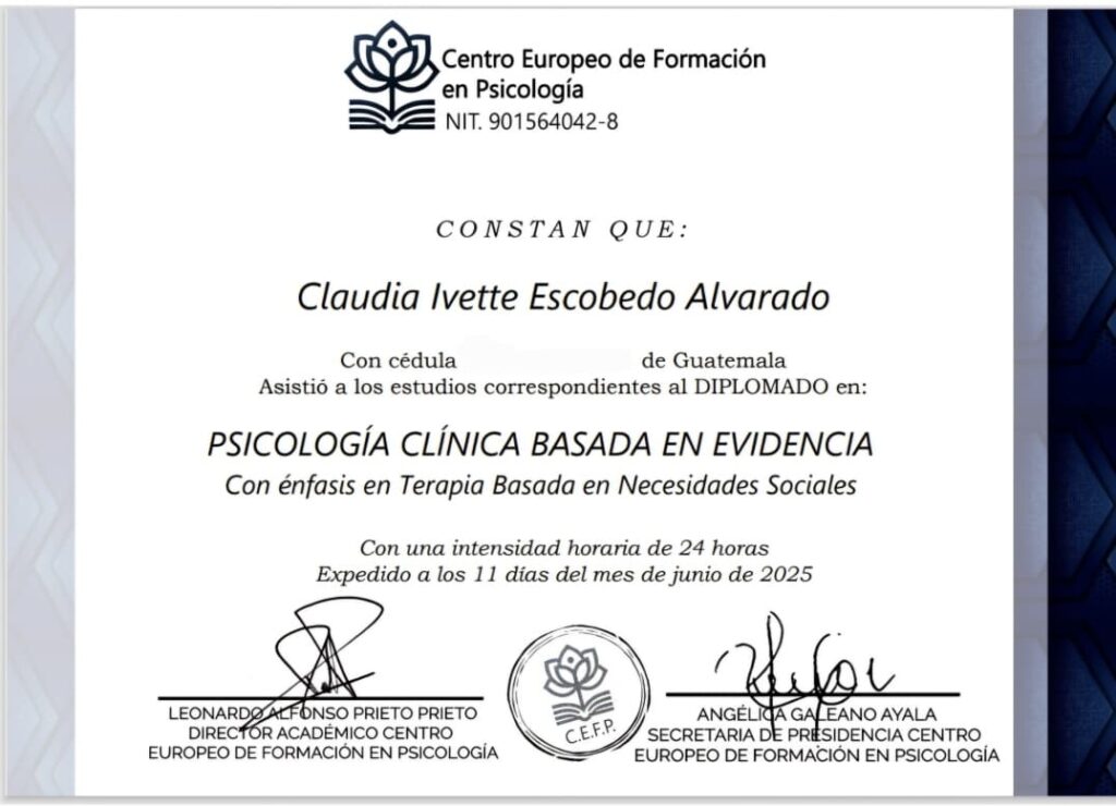 Psicóloga clínica por la universidad Rafael Landivar, entrenada en terapia cognitiva, terapia neuronet, terapia narrativa centrada en soluciones y programación neurolingüística. Empresaria, humanista, activista, madre.